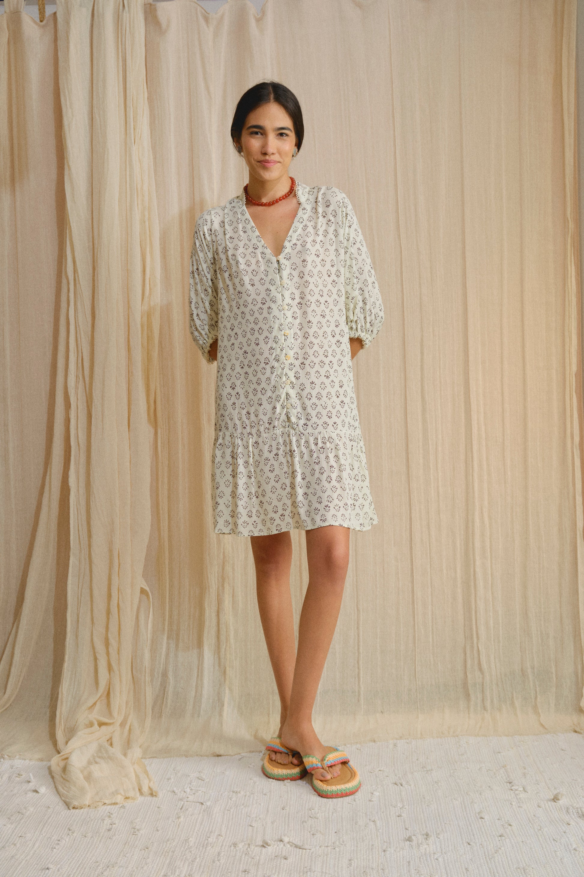 Kori es un vestido ligero y cómodo, confeccionado en 100% algodón. Su silueta relajada se adapta al cuerpo con naturalidad, mientras su estampado orgánico y los botones de nácar aportan un detalle sutil y atemporal. De talla única, es una pieza fresca y versátil para acompañarte en los días de verano.